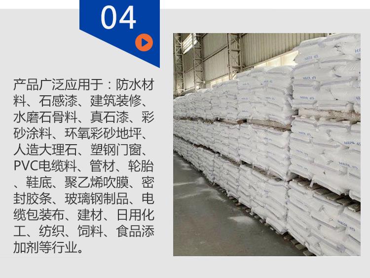 橡膠、塑料、塑鋼門(mén)窗、PVC電纜料 、高級(jí)涂料、管材、輪胎、鞋底、聚乙烯吹膜、密封膠條、玻璃鋼制品、電纜包裝布、造紙、建材、油墨、日用化工、紡織、飼料、食品添加劑